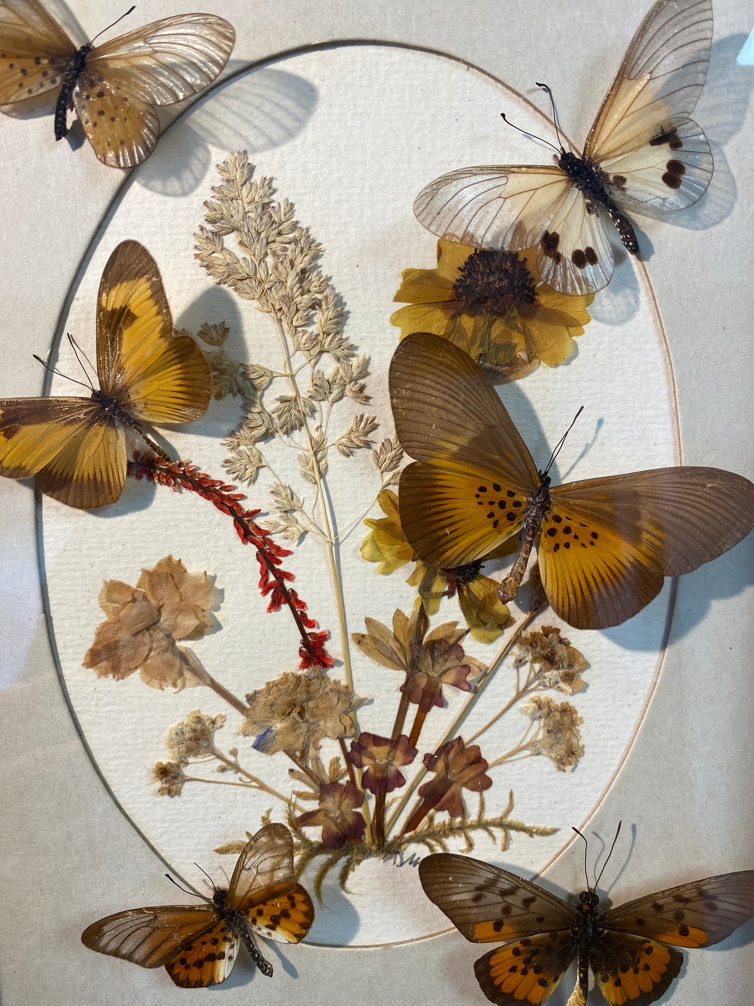 Cadre vitrine contenant une réalisation en fleurs séchées dans l’esprit d’un herbier ( chiner) avec divers papillons issu d’une ancienne collection.