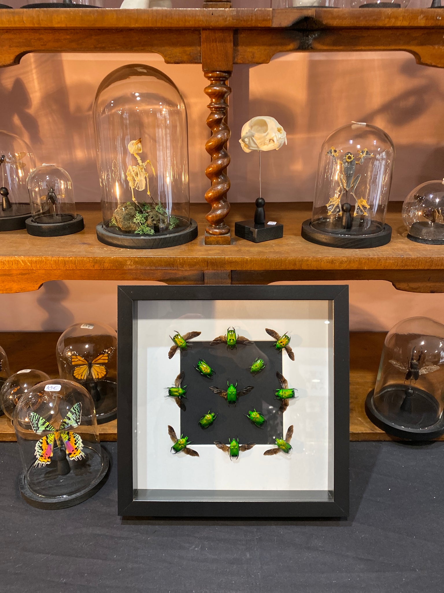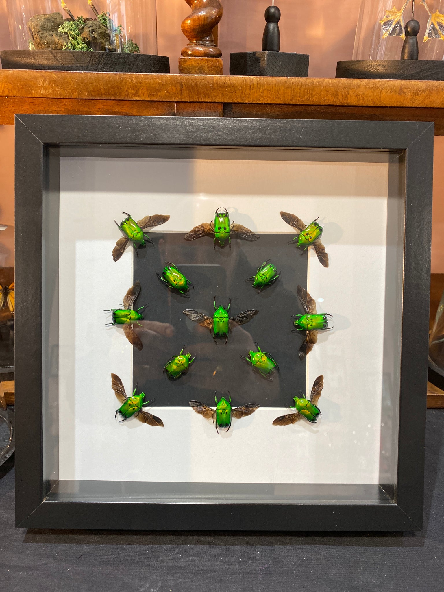 Cadre vitrine carré avec de véritables scarabées heterorrhina sexmaculata d’Indonésie ailes ouvertes et fermés, mis en valeur en symétrie sur fond noir et blanc.