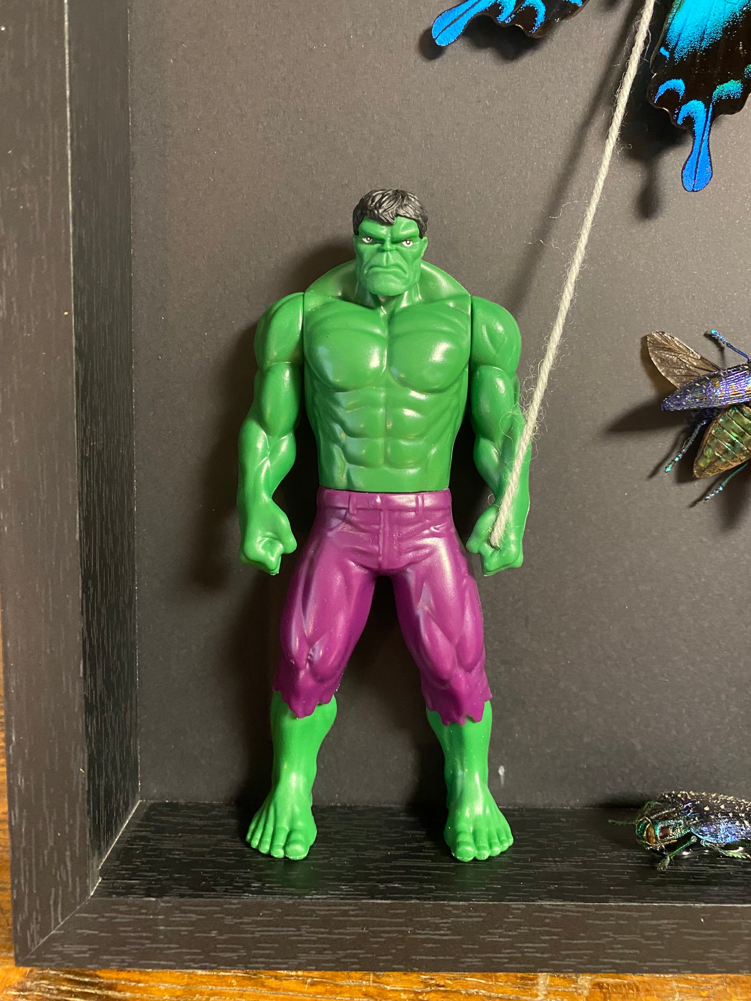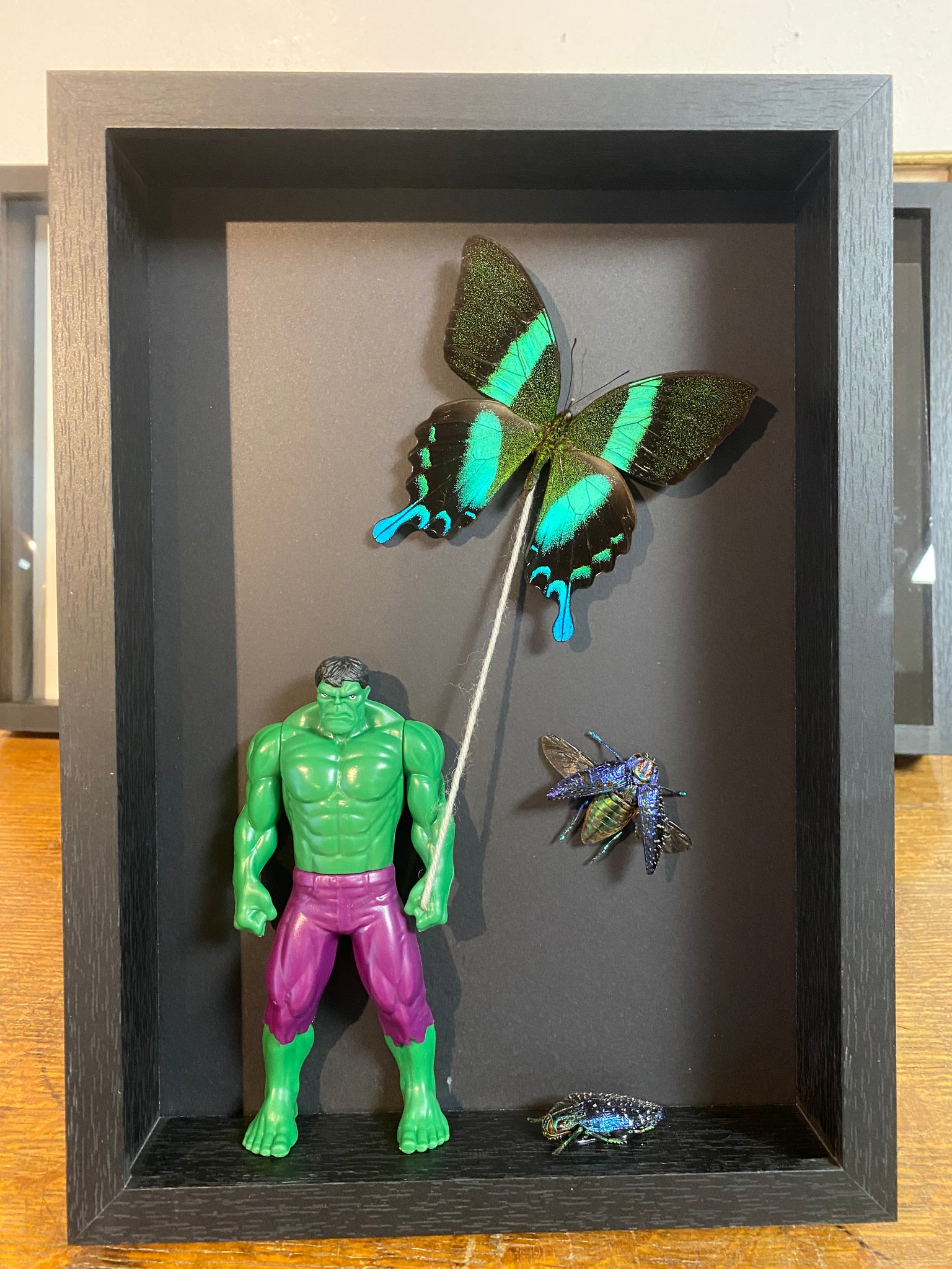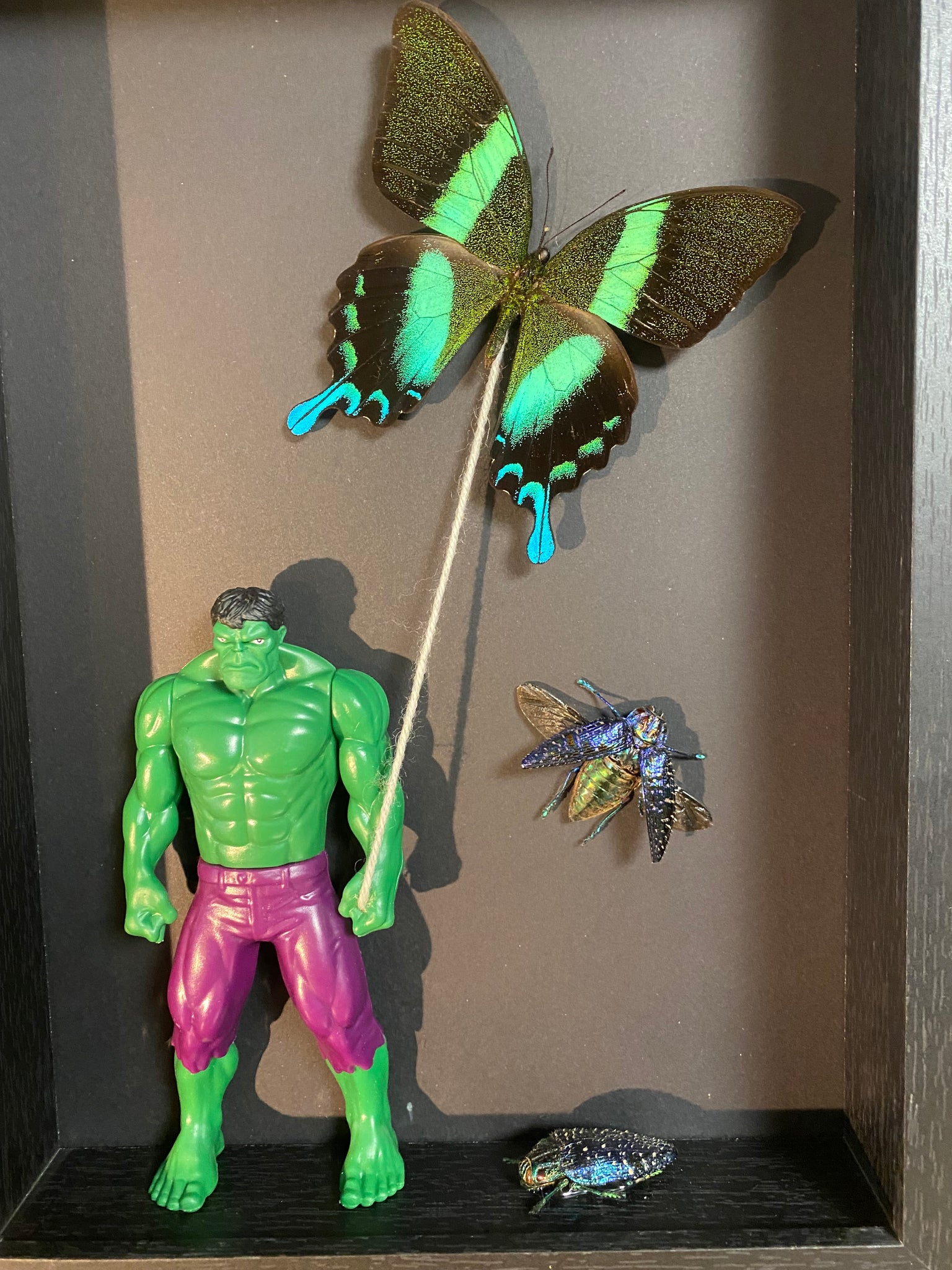 Cadre « Hulk» avec une envolée de papillon papilio blumei d’Indonésie et deux scarabées lampropepla rothschildi de Madagascar.