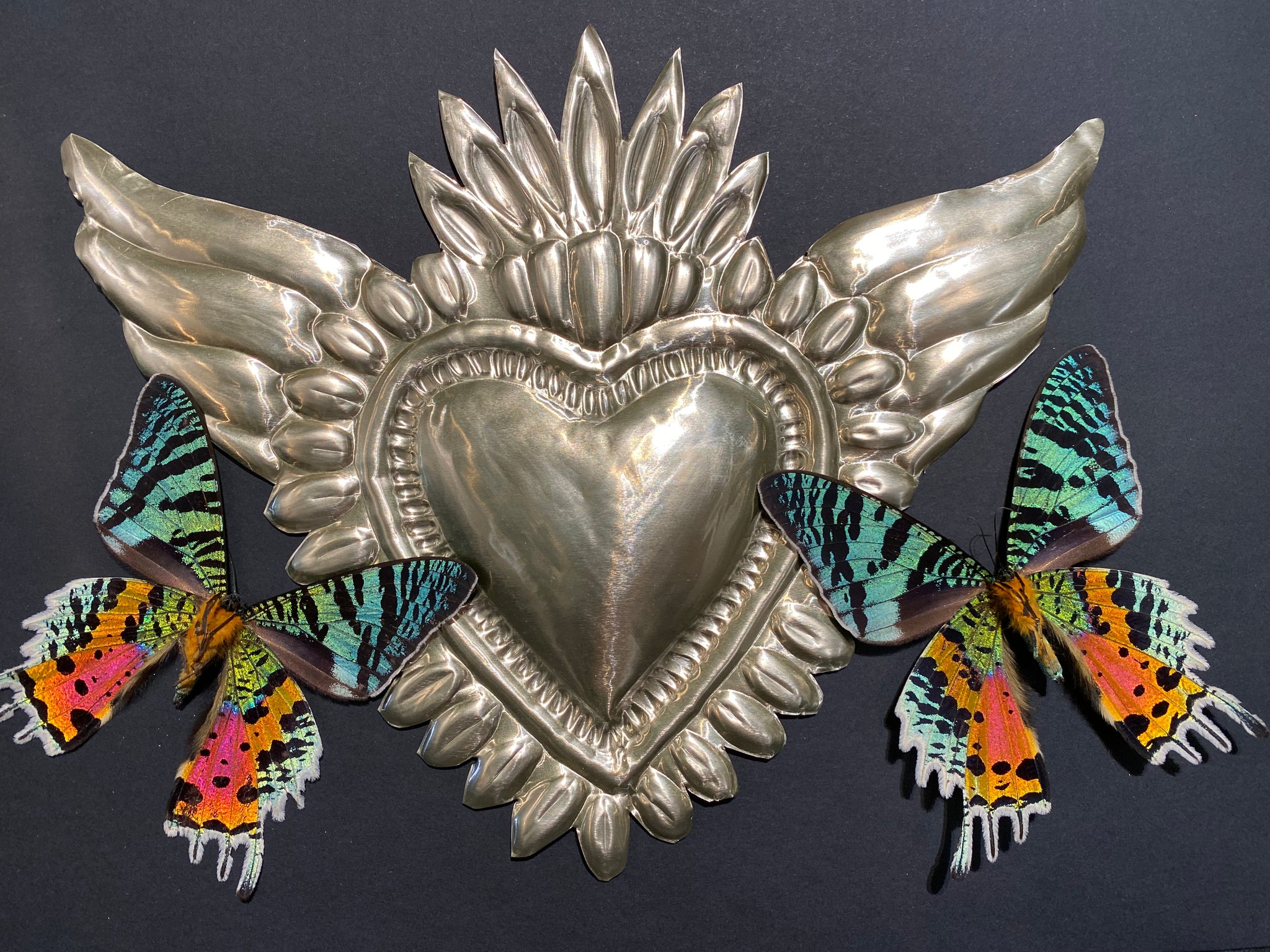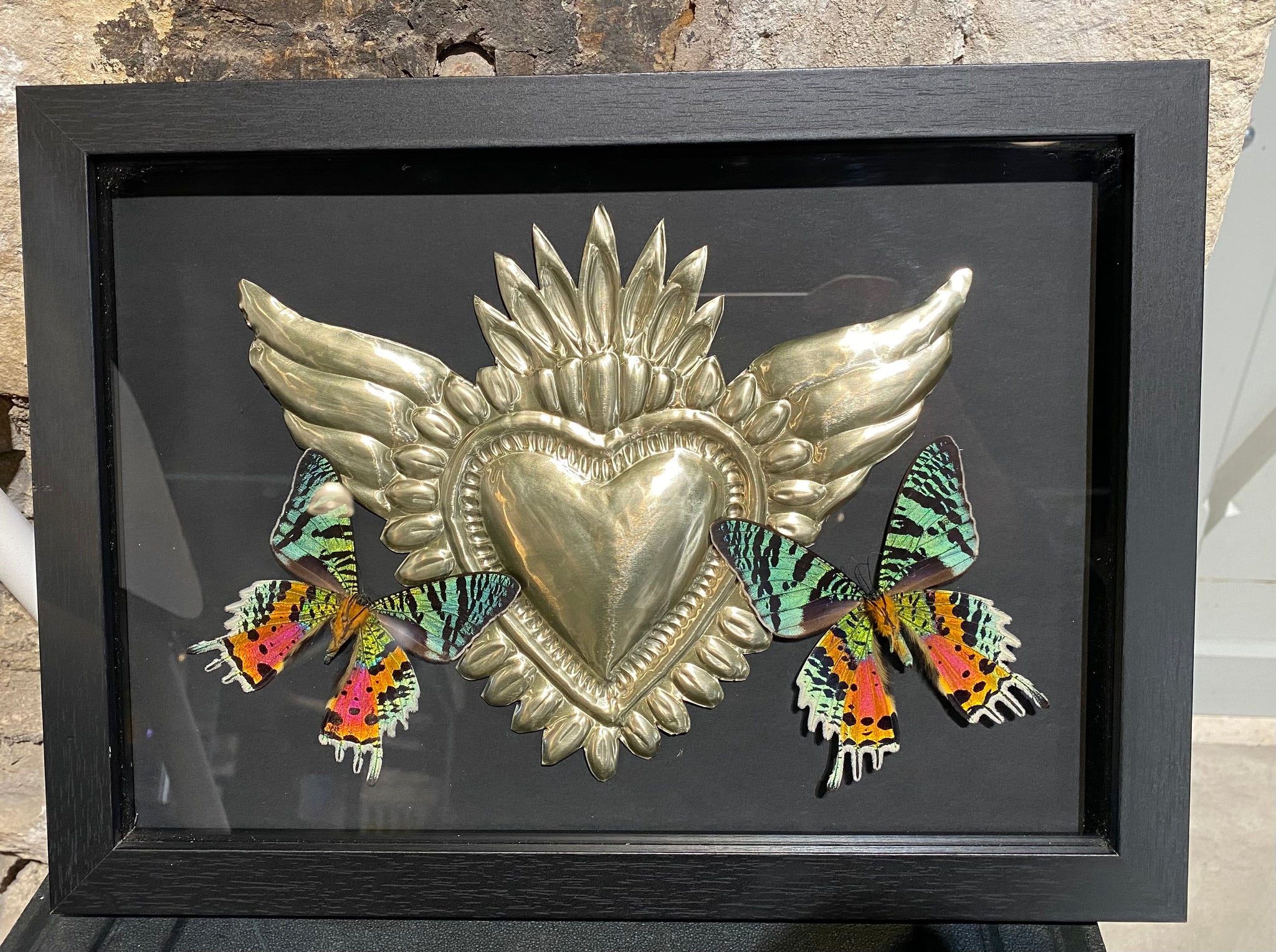 Cadre vitrine contenant un coeur sacré en métal doré réalisé manuellement dans notre atelier avec un duo d'urania ripheus de Madagascar.