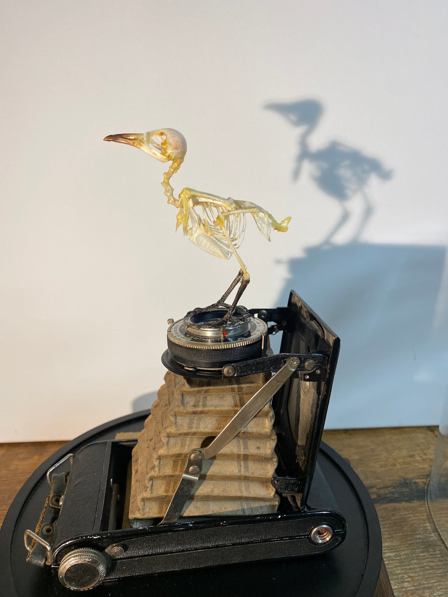 Globe « le petit oiseau est sorti », réalisé avec un ancien appareil photo à soufflet et un véritable squelette d’oiseau geopilia striata d’Indonésie.