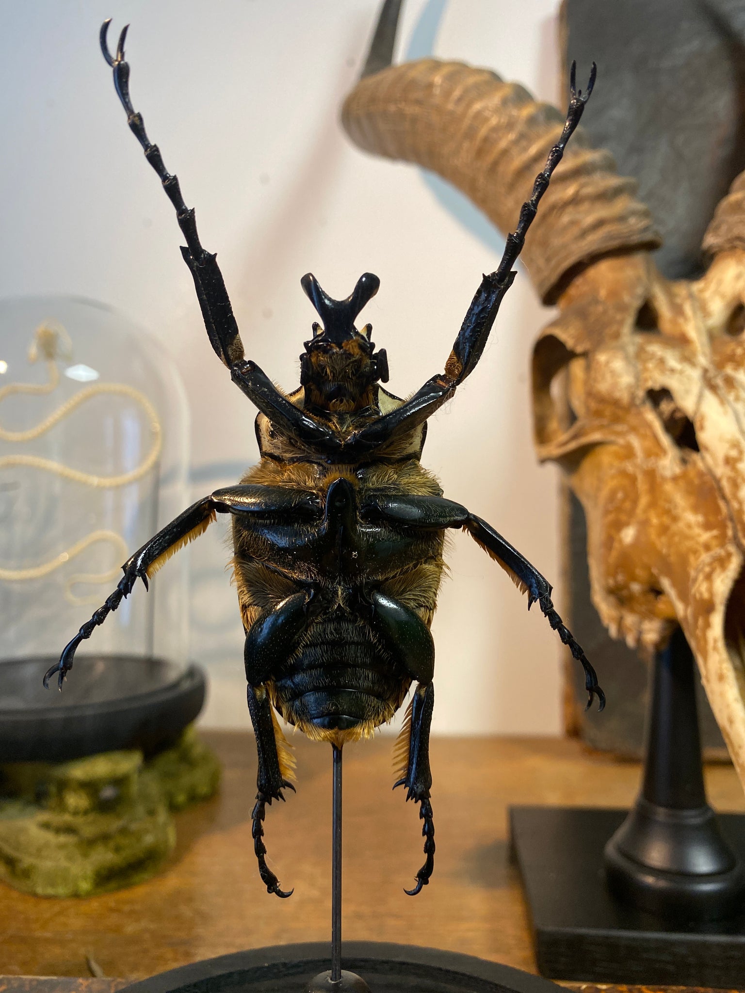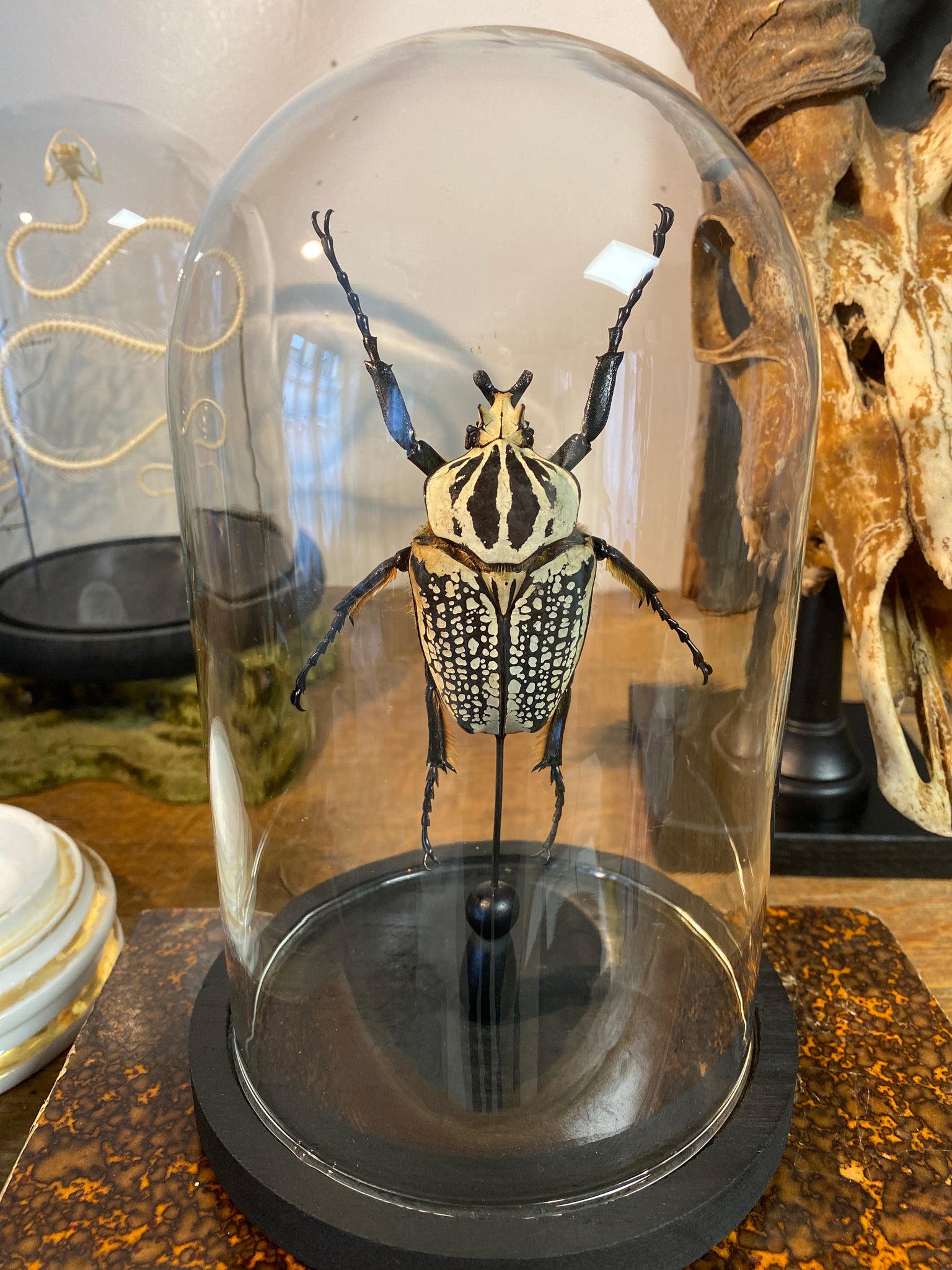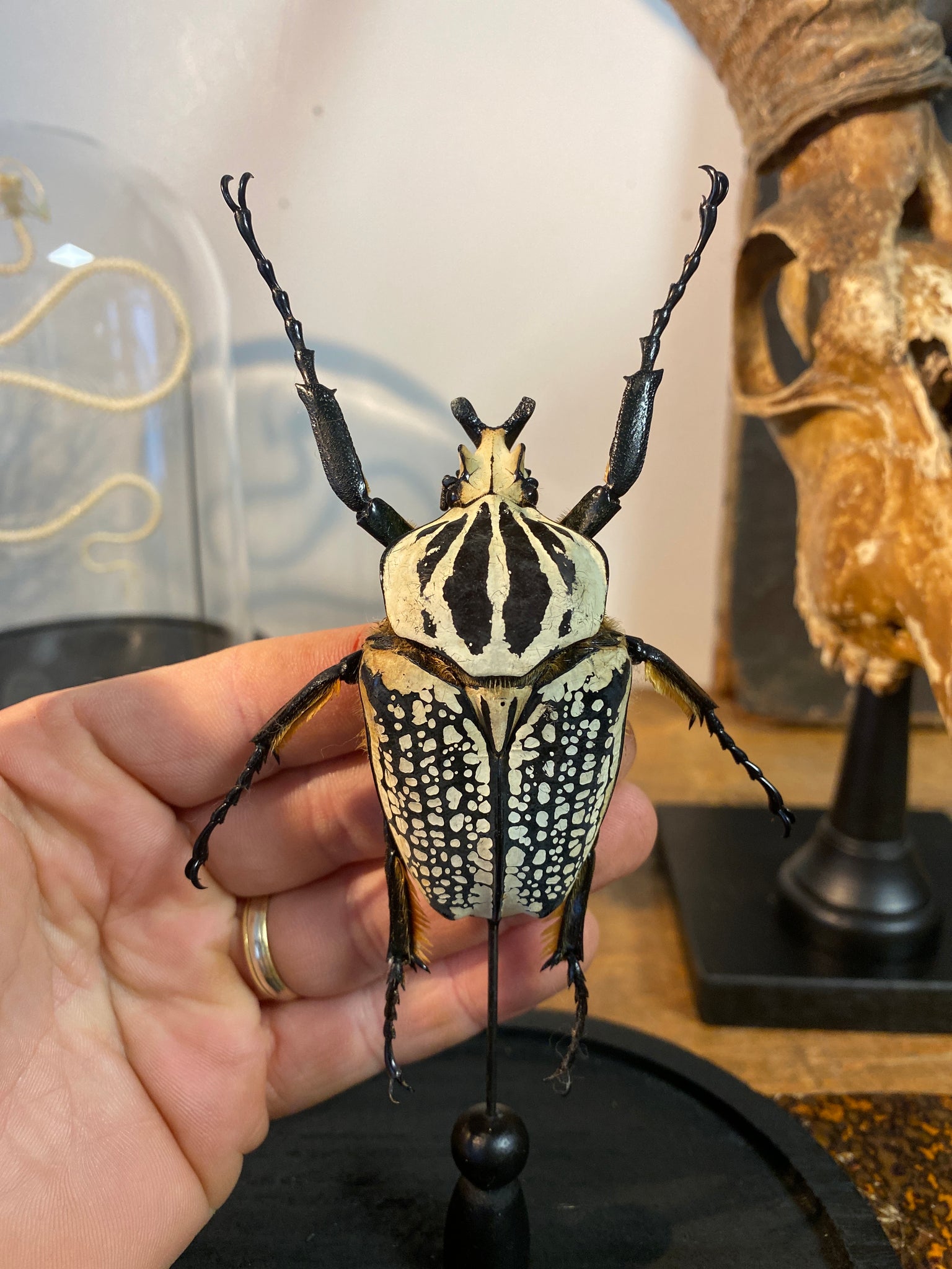 Superbe goliathus oriantalis présenté sous un globe/cloche en verre, monté sur un support en bois peint et fine tige métallique. taille totale 22 cm de haut et 15 cm de diamètre au socle. Envoi soigné.