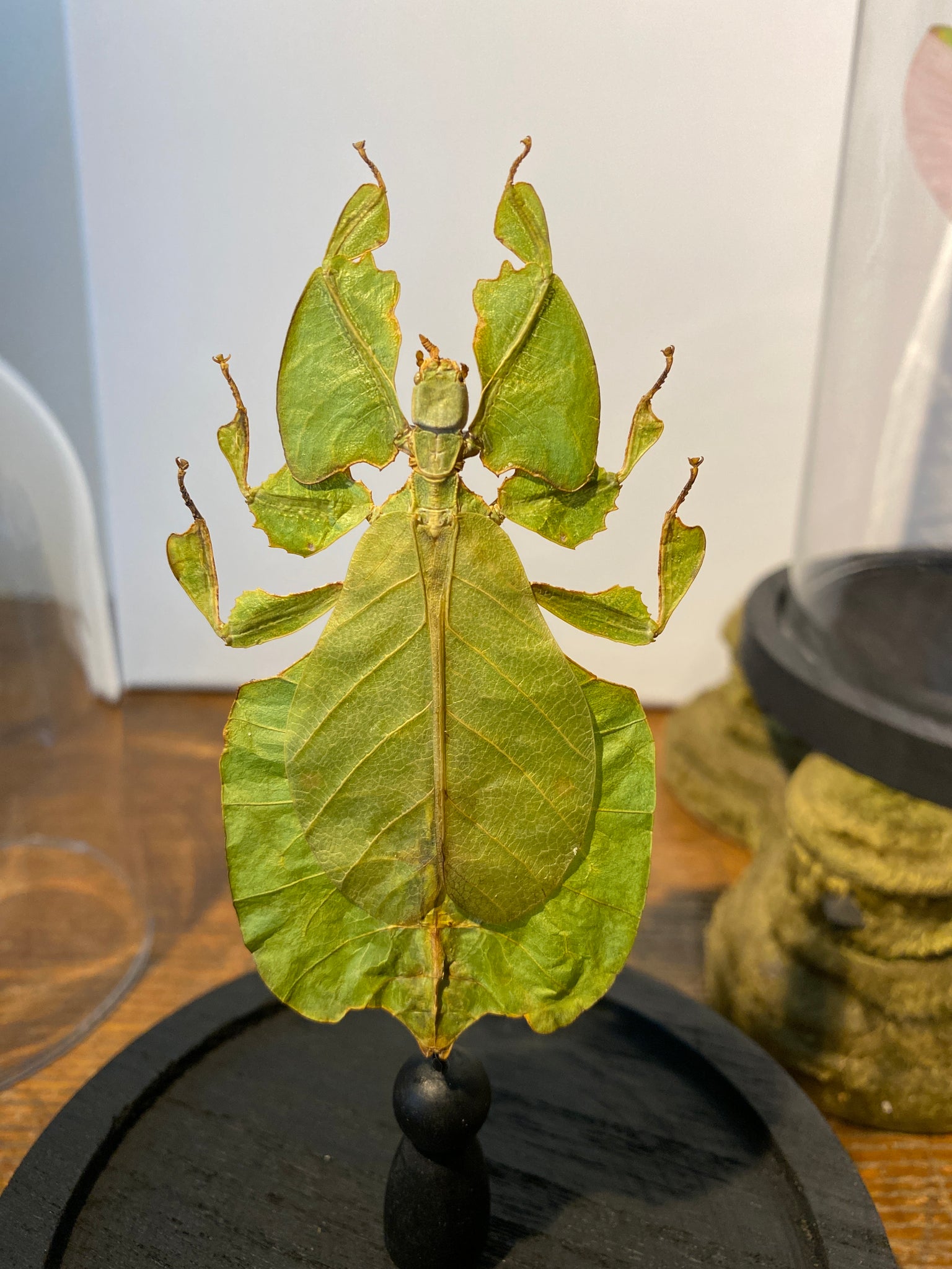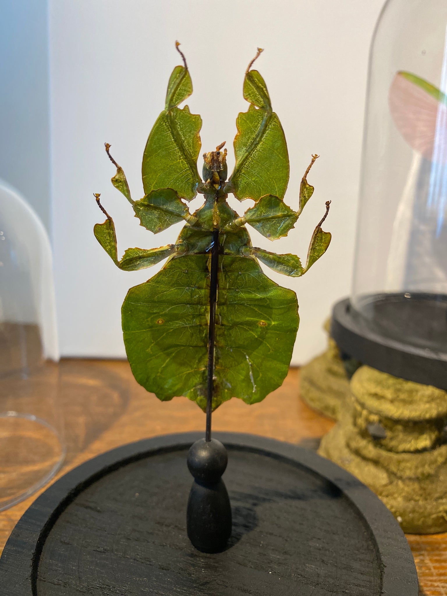 Cloche en verre contenant un phasme feuille phyllium pulchrifolium d’Indonésie.