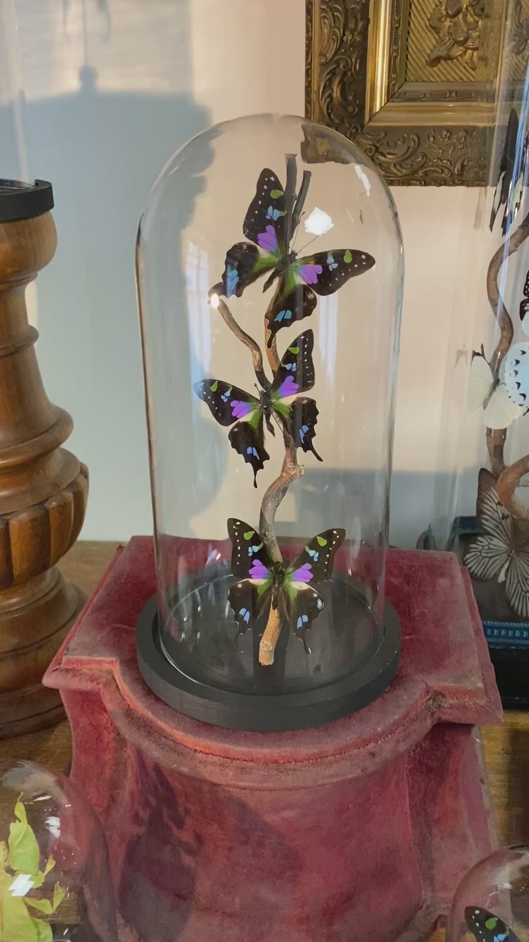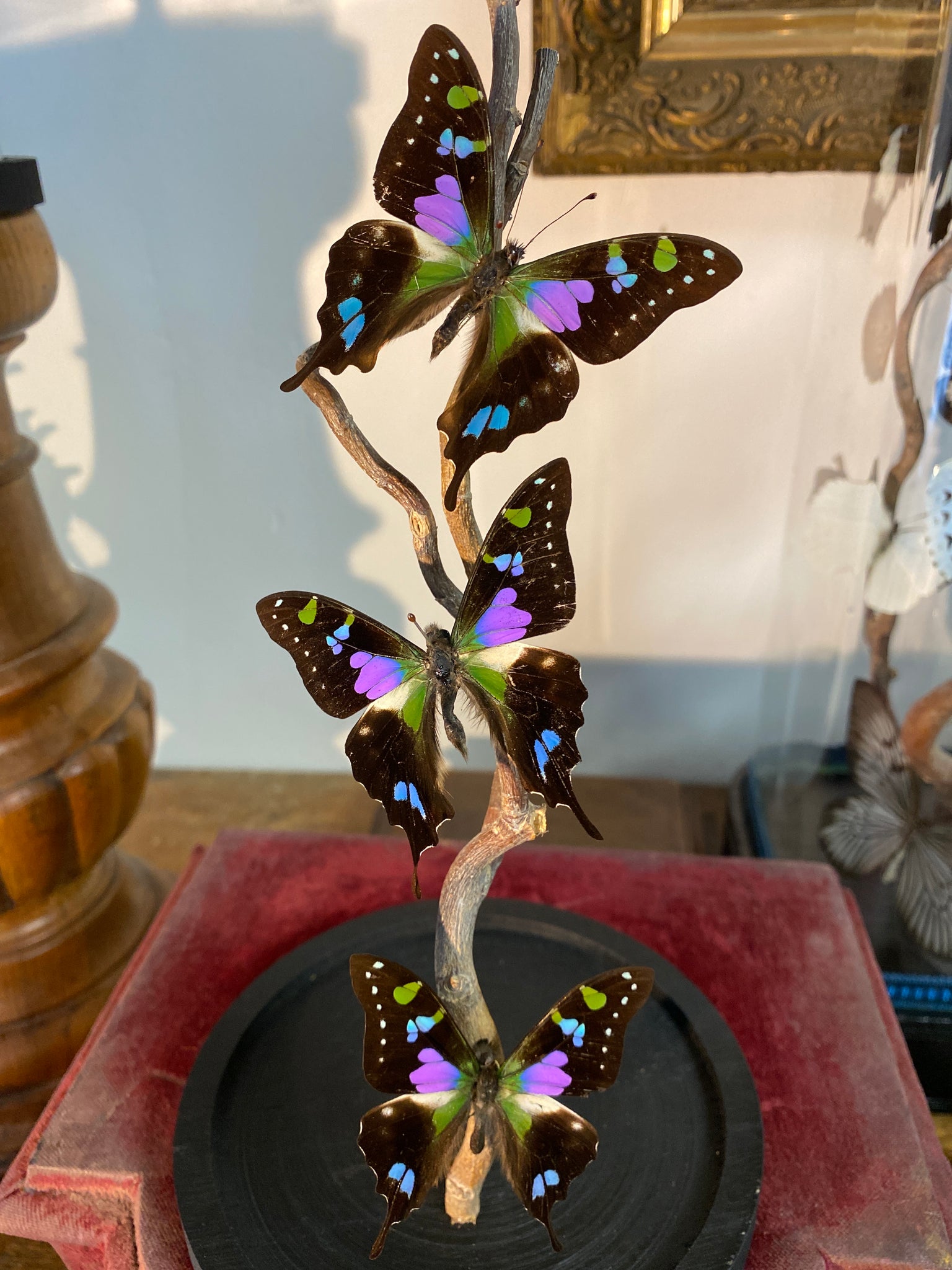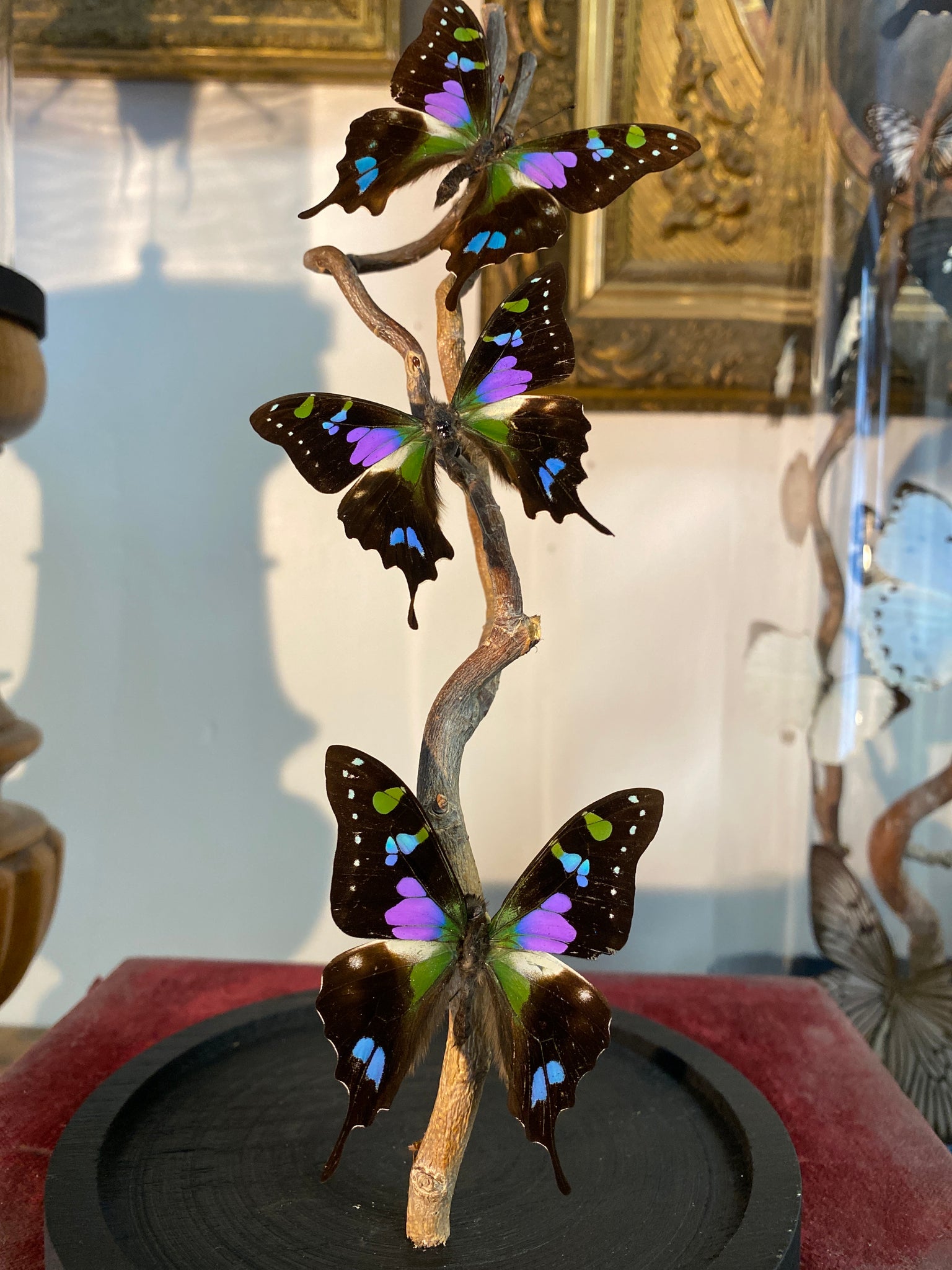 Envolée de trois papillons graphium weiskei fixés sur du saule tortueux et mis en valeur sous un globe ( cloche) en verre.