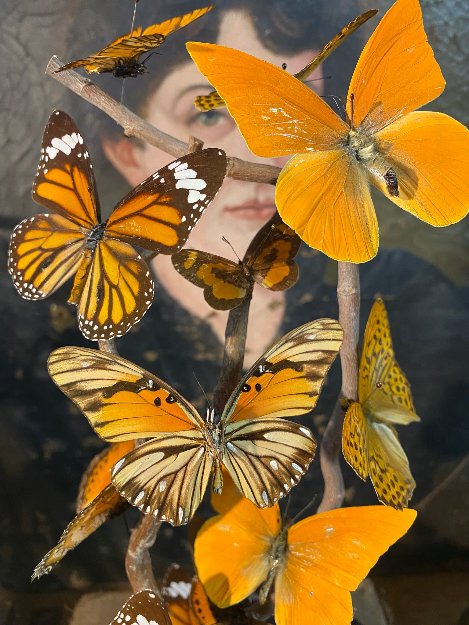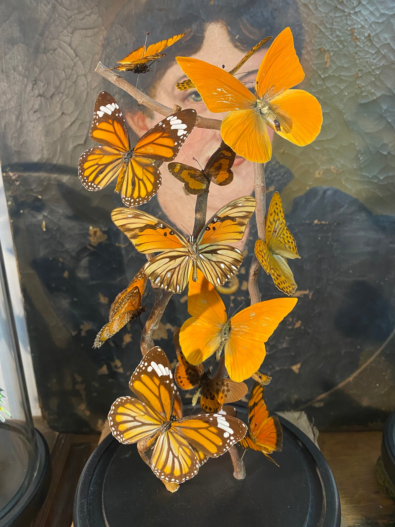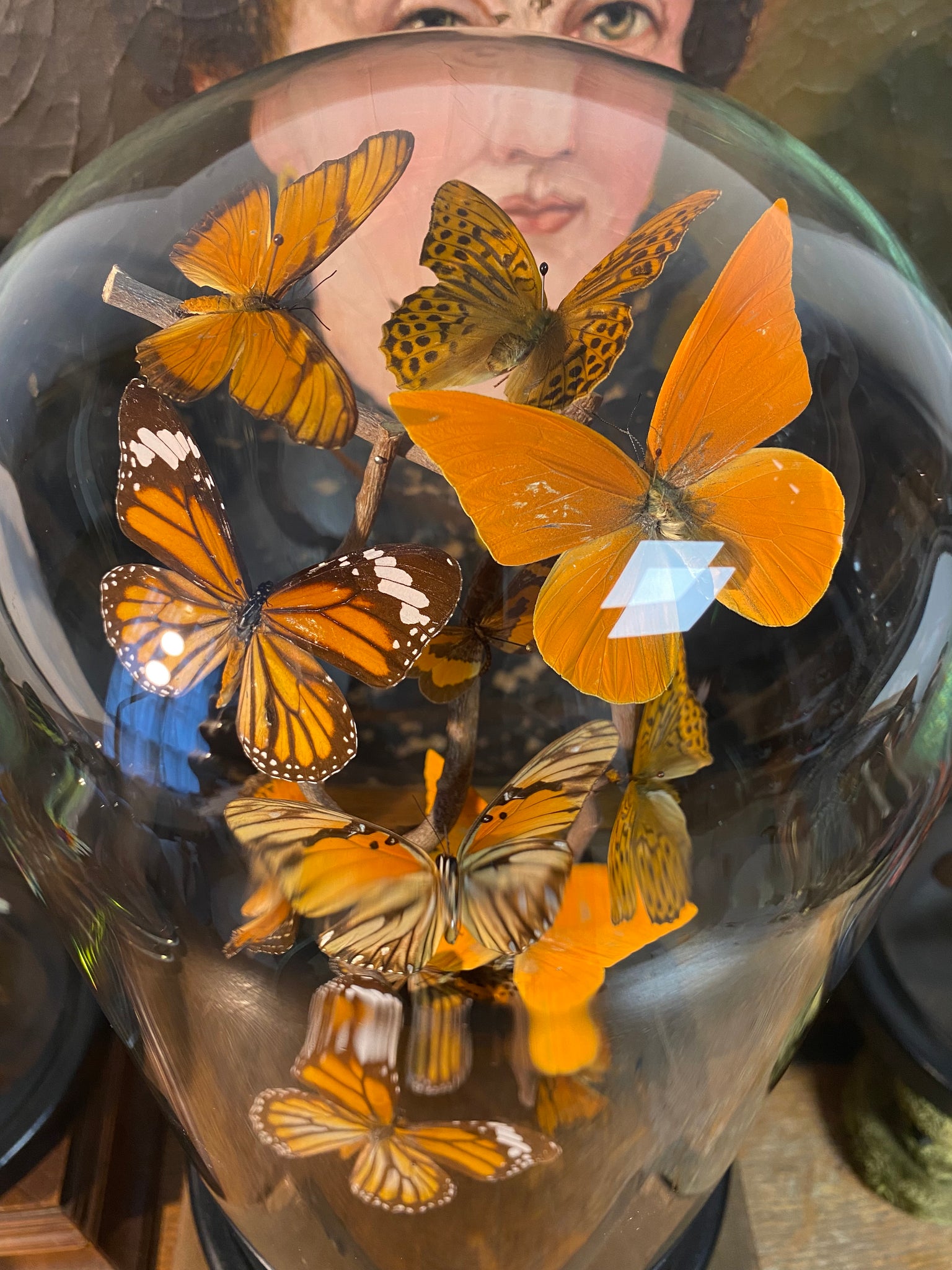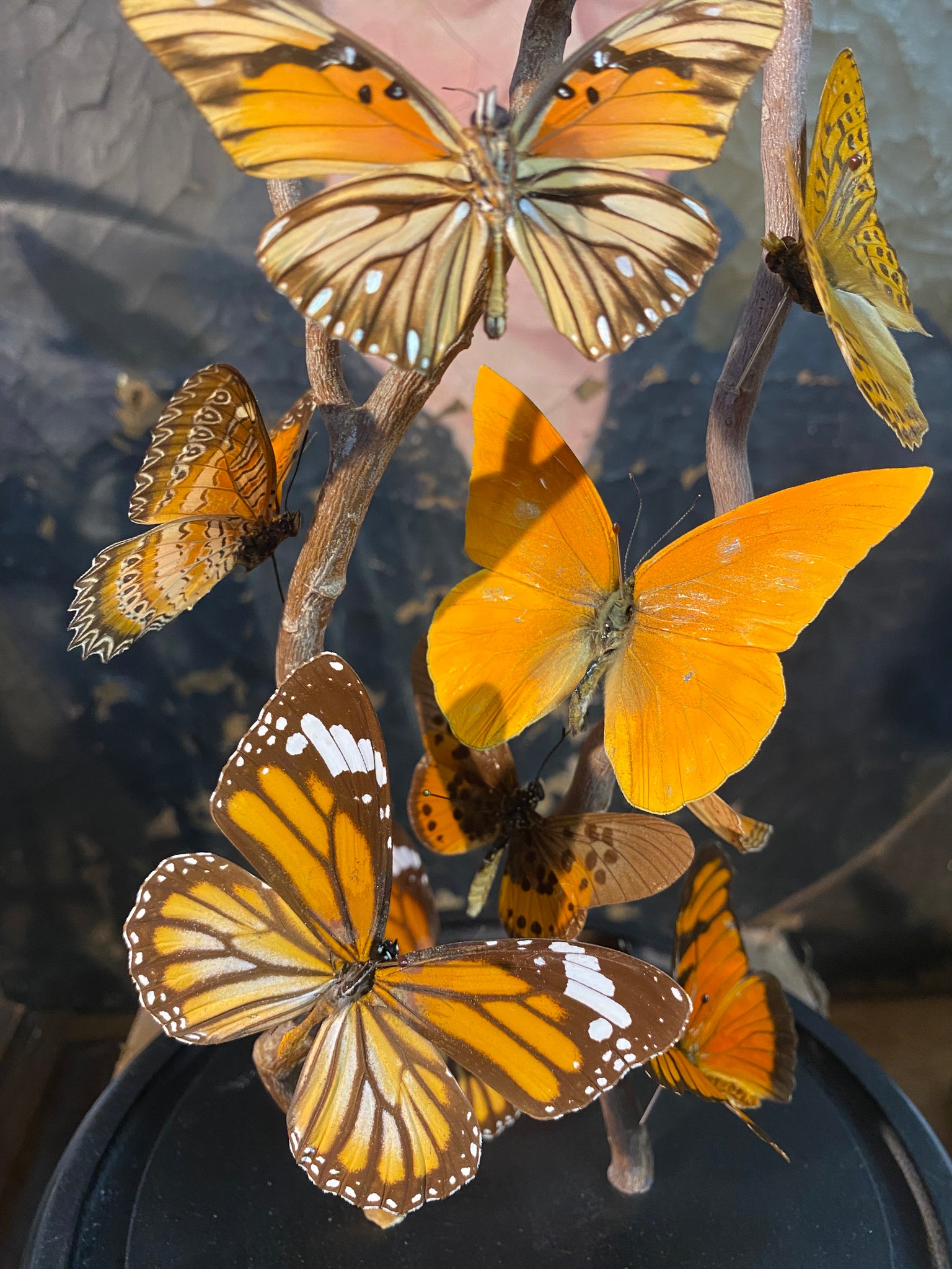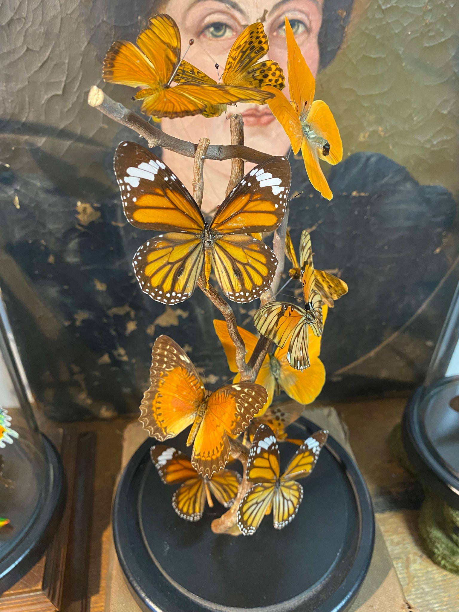 Envolée de divers spécimen de papillons dans les ton marron. Creation mis en valeur sur du bois tortueux et protéger sous un globe en verre avec socle en bois noir. Taille total du globe 31 cm de haut et 17 cm de diamètre. |