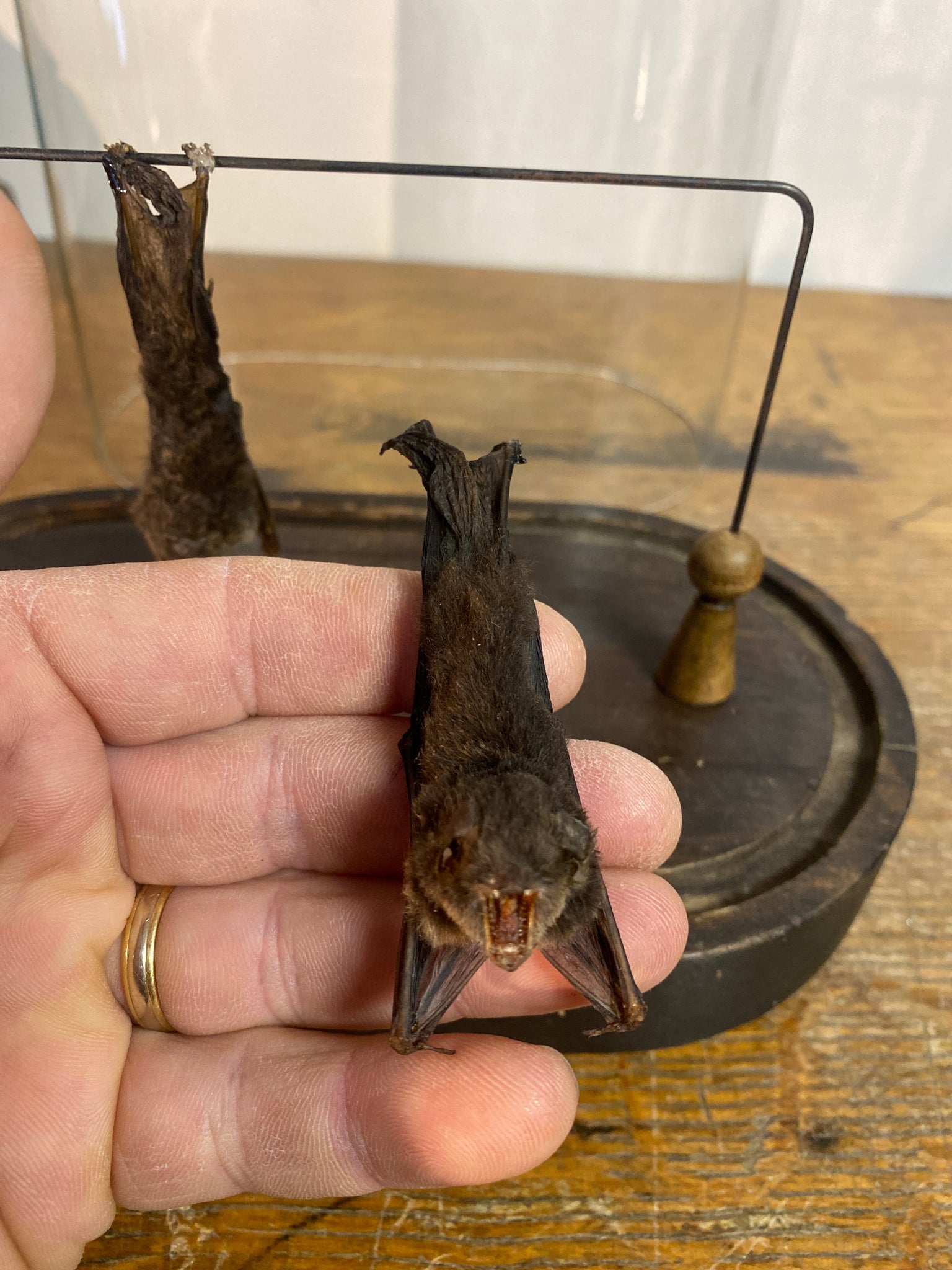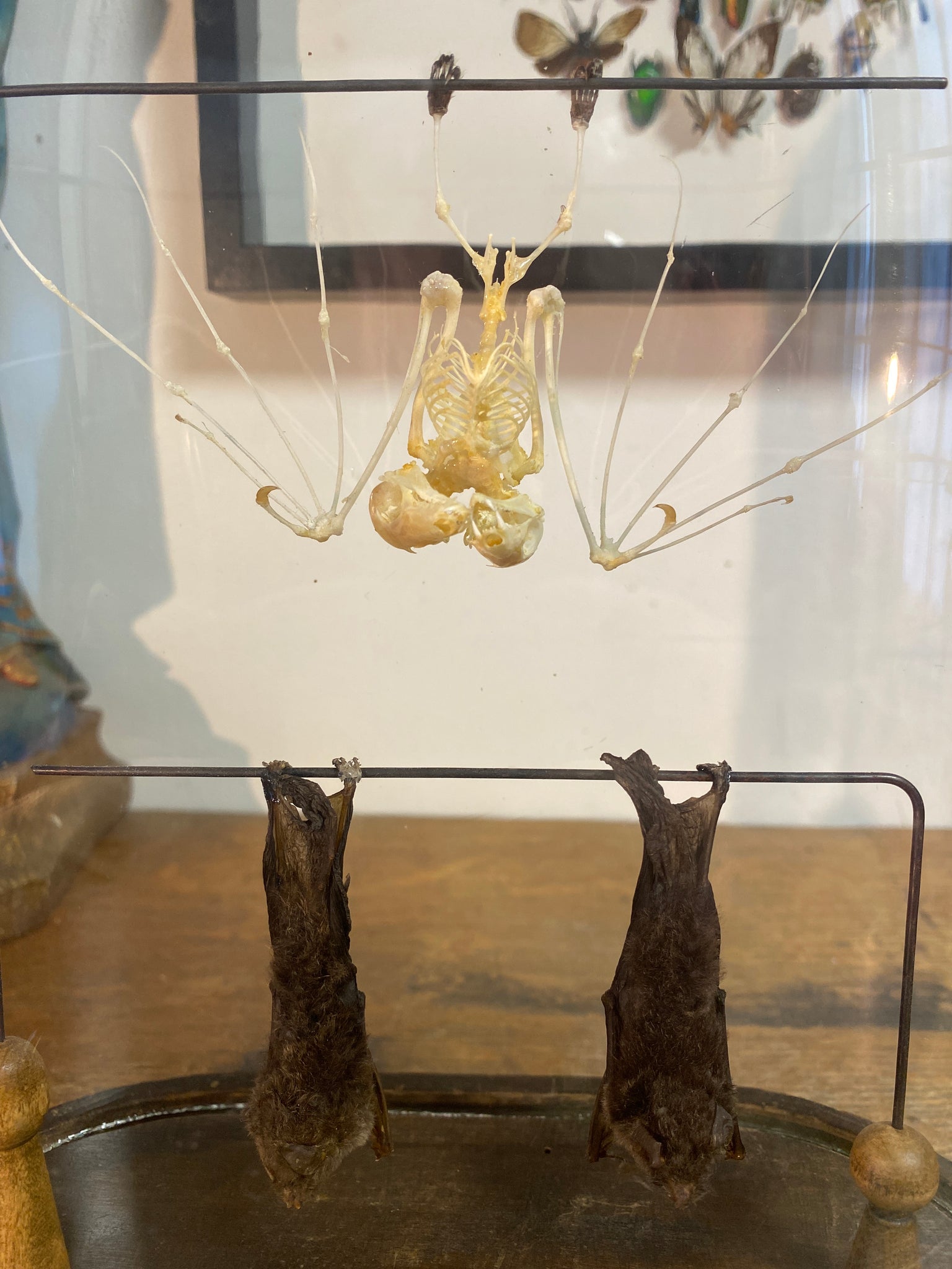 Véritable squelette de Chauve souris monté en bicéphale et deux chauve-souris séchées mis sous globe en verre napoleon 3 avec socle noir et perchoirs en métal.