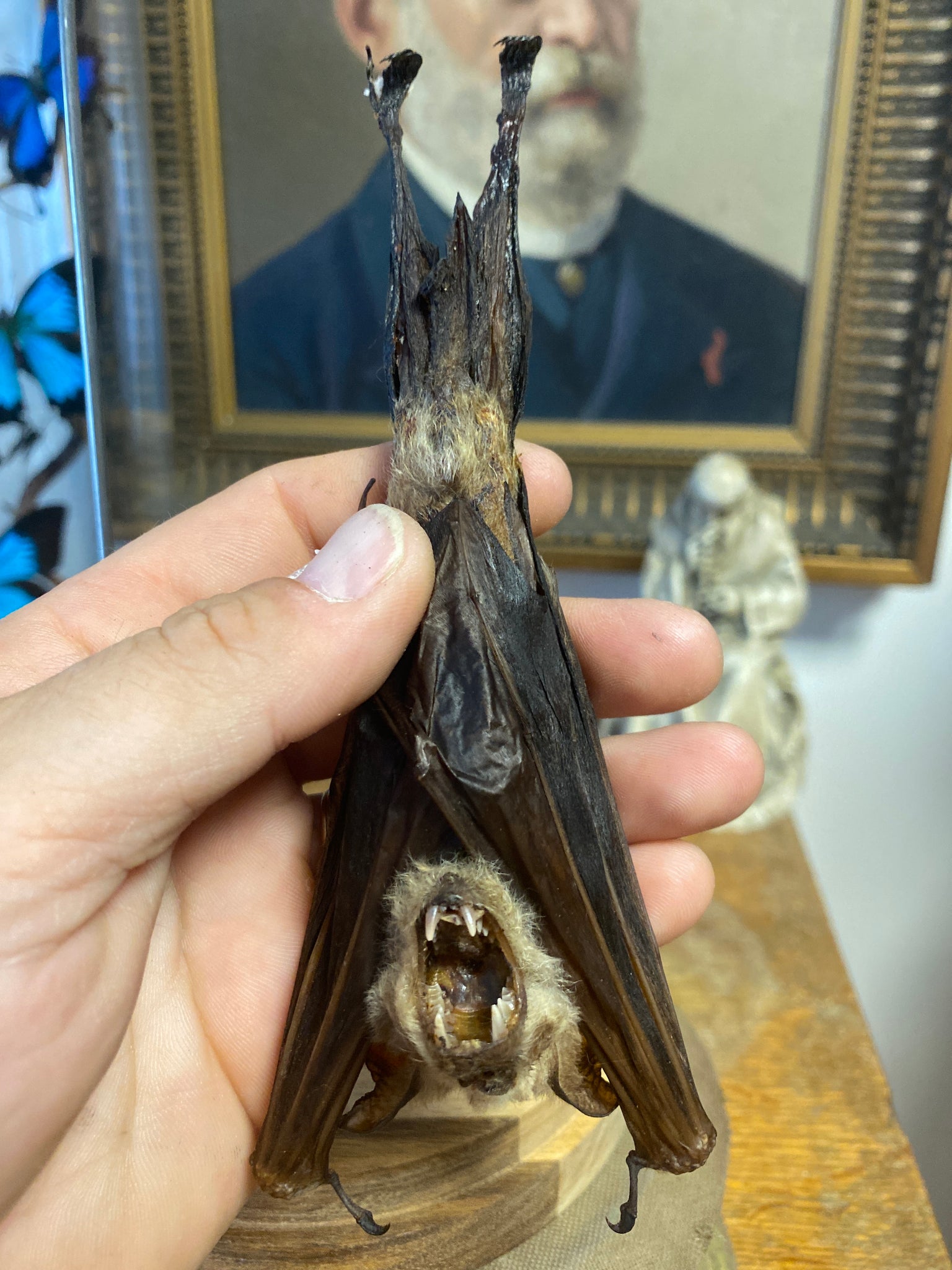 Véritable chauve-souris sécher ( hipposideros diadema ) présenter sous une cloche en verre avec un socle en métal doré et un perchoir en métal.