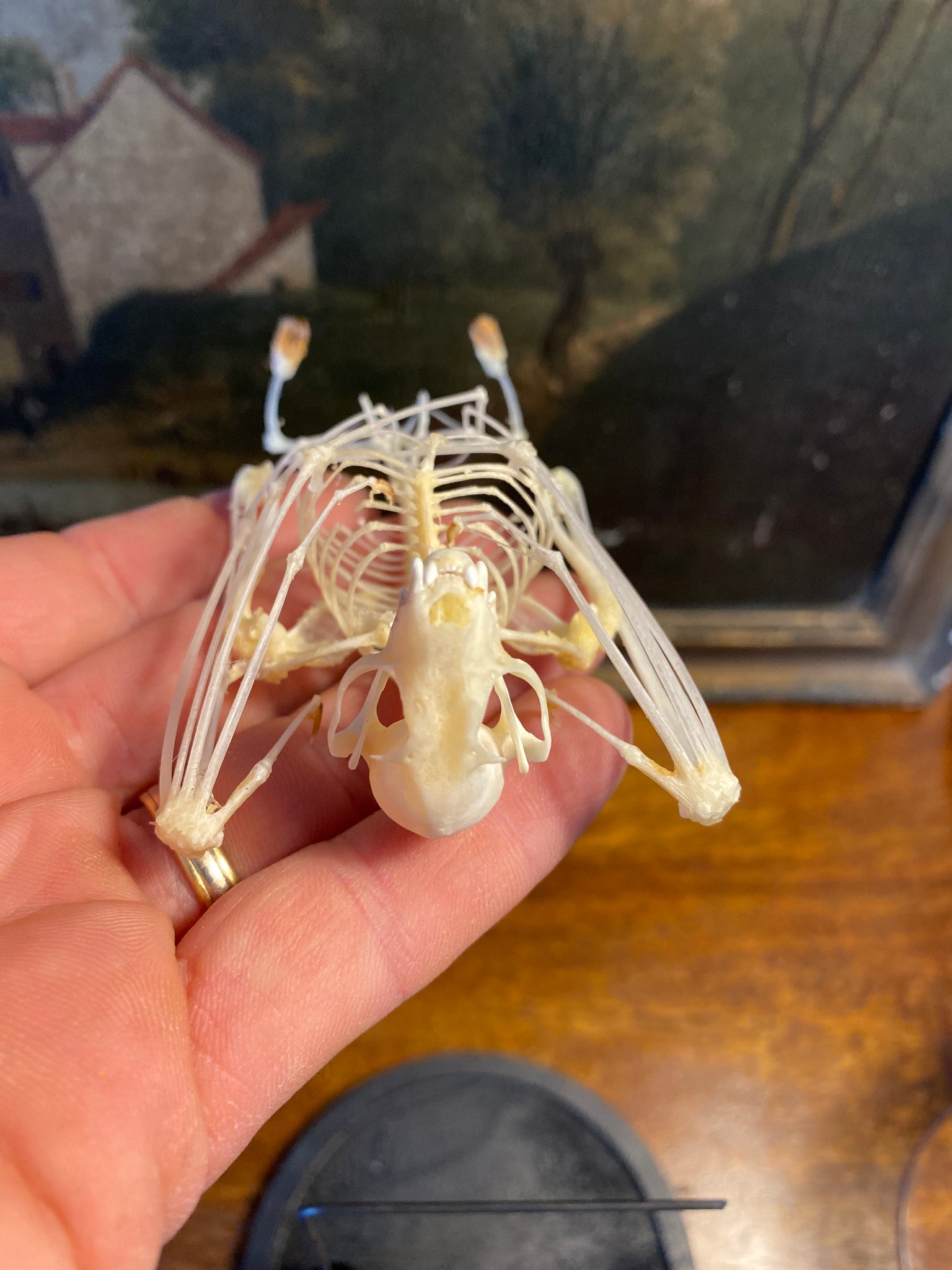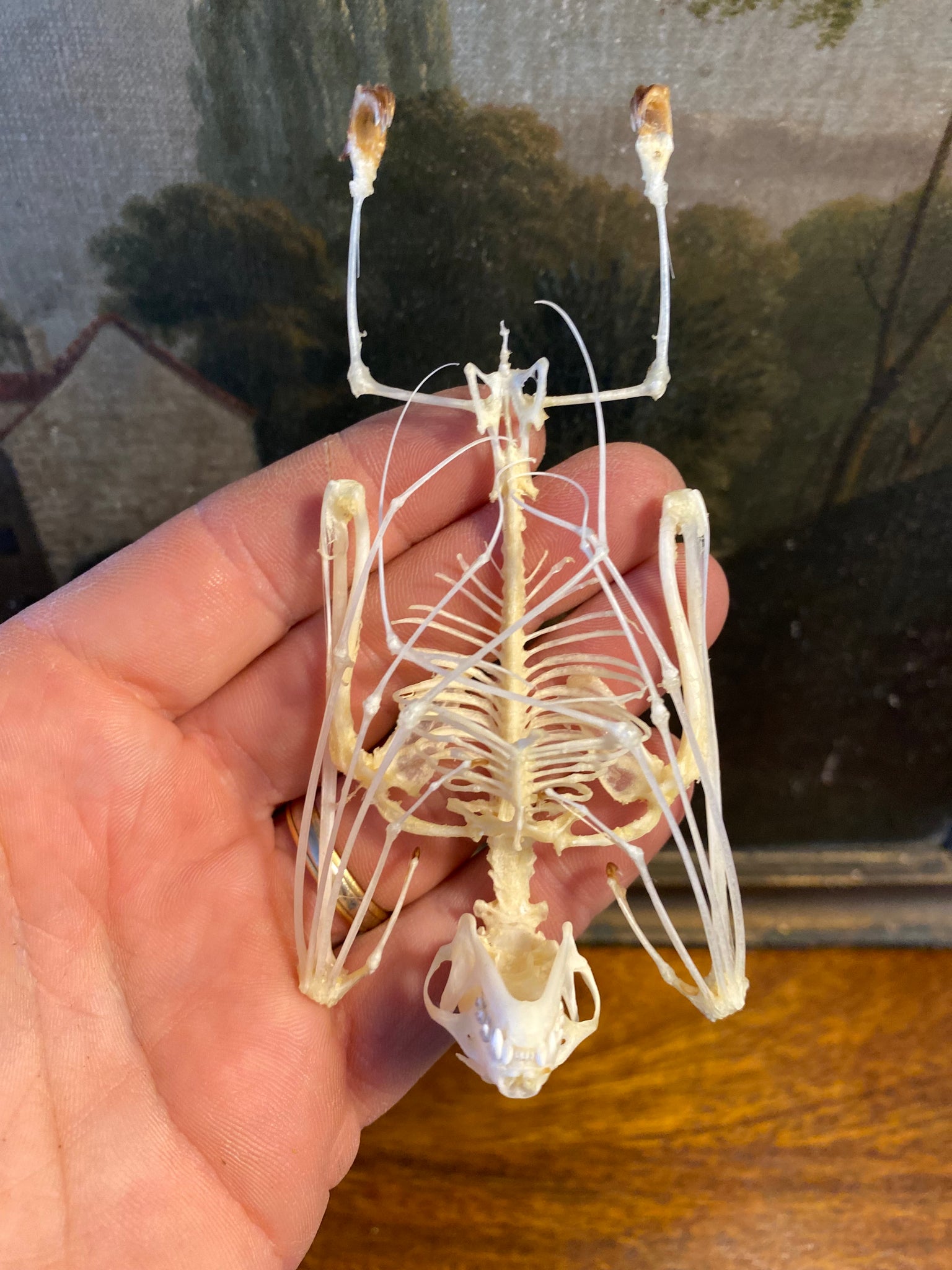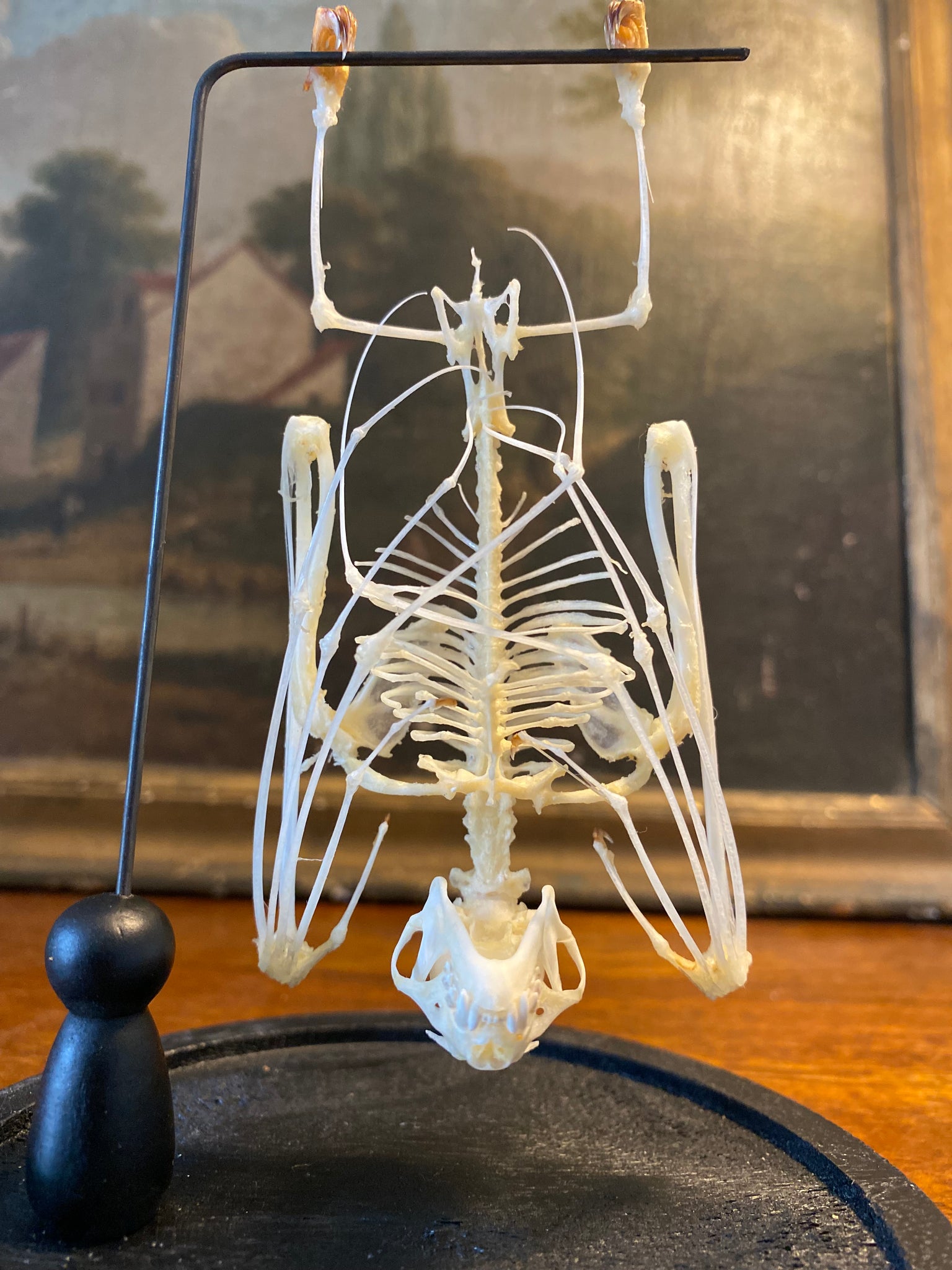 Véritable squelette de chauve-souris ( cynopterus brachyotis) présenter sous une cloche en verre avec un socle en bois et un perchoir en métal.