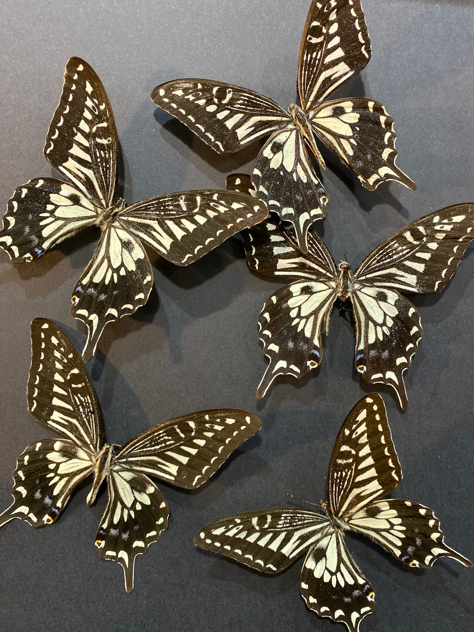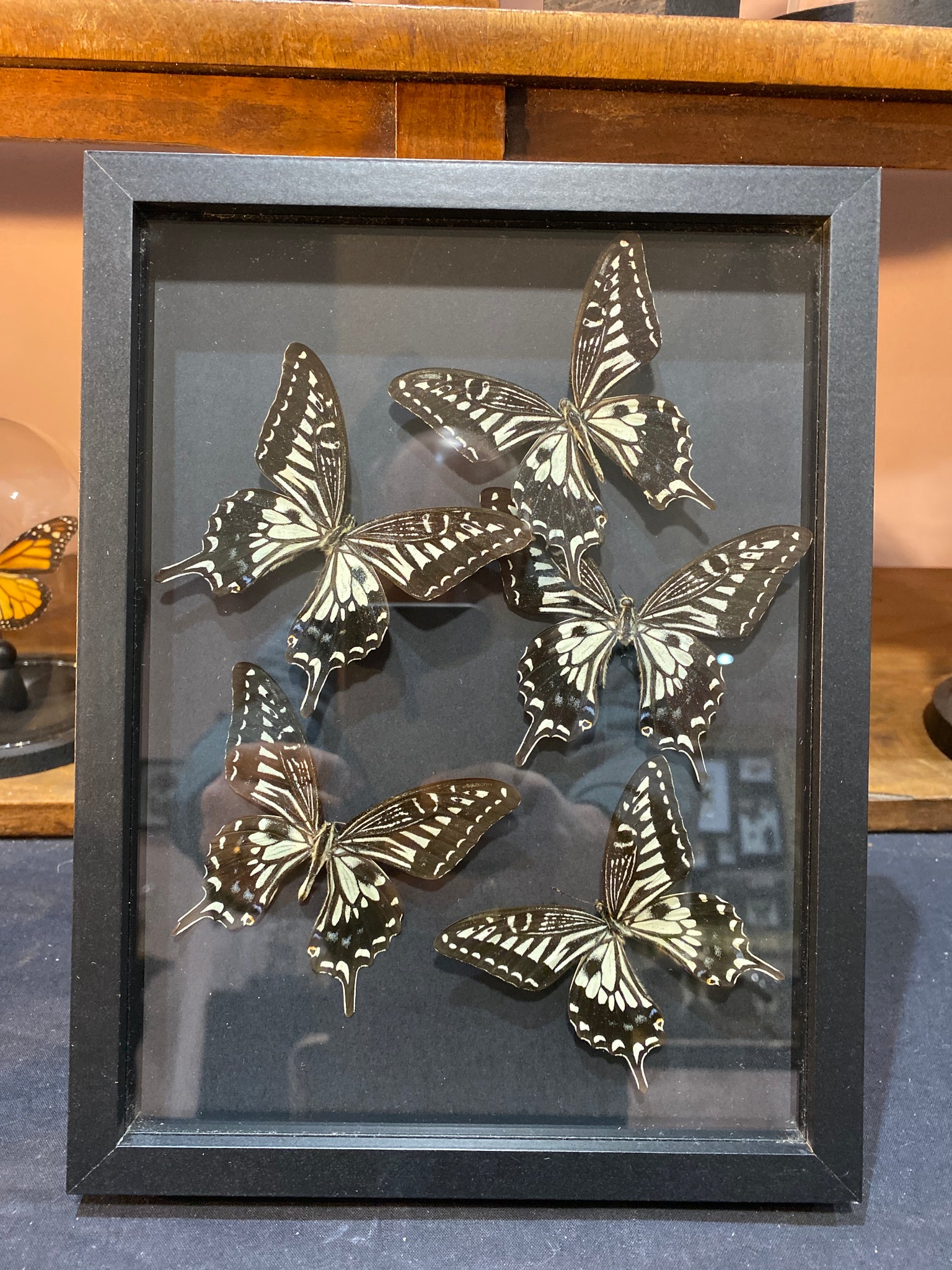 Cadre vitrine avec une envolée de papillons ayant de léger défaut ( manque d’antennes ou de corps.)