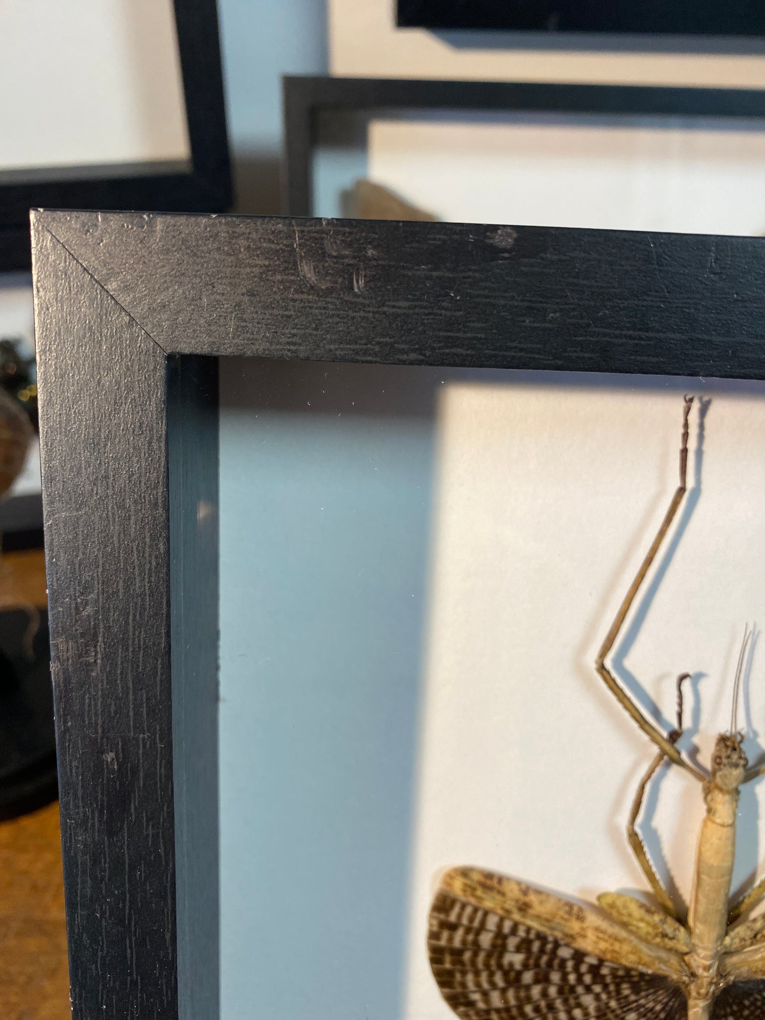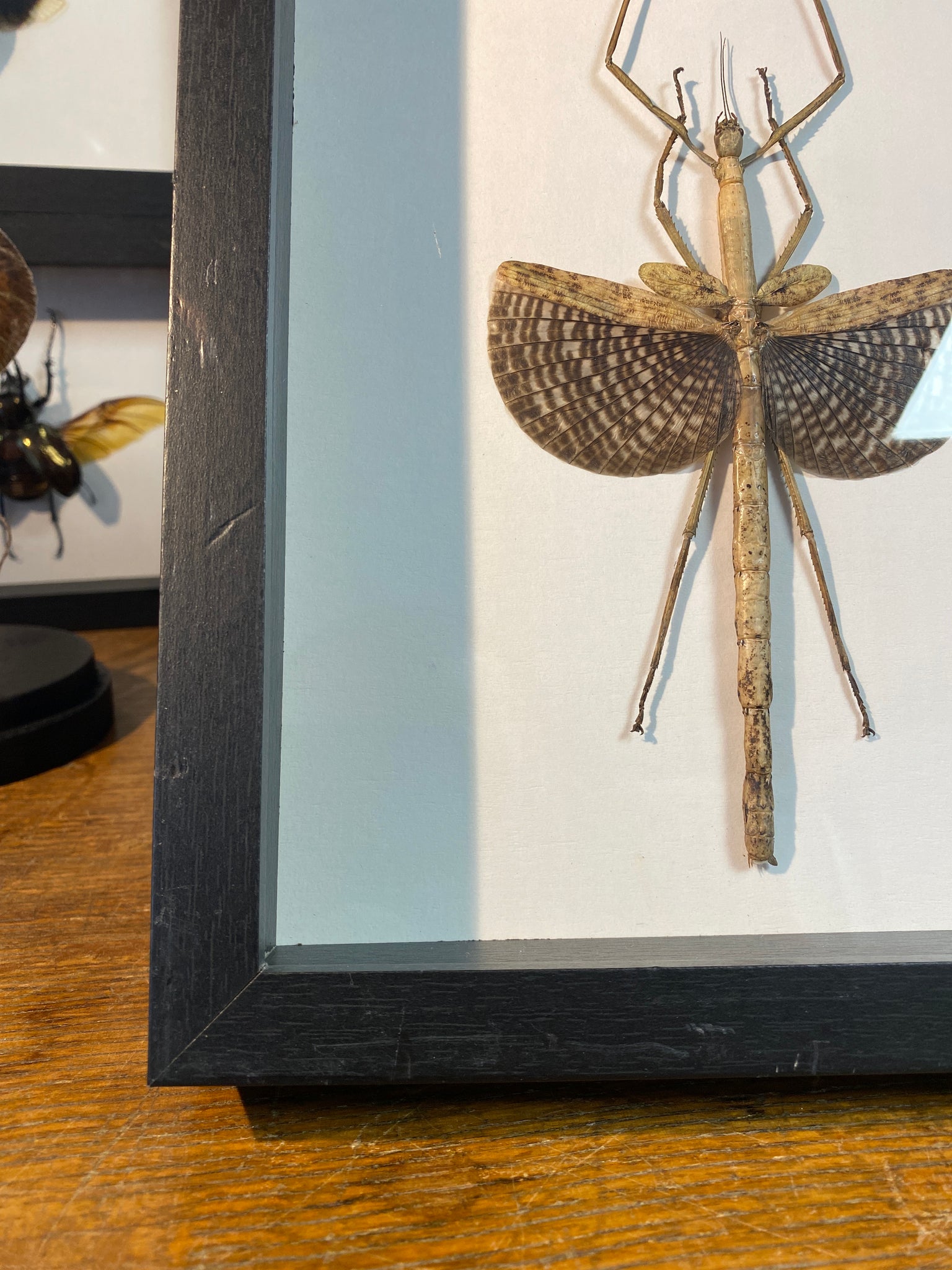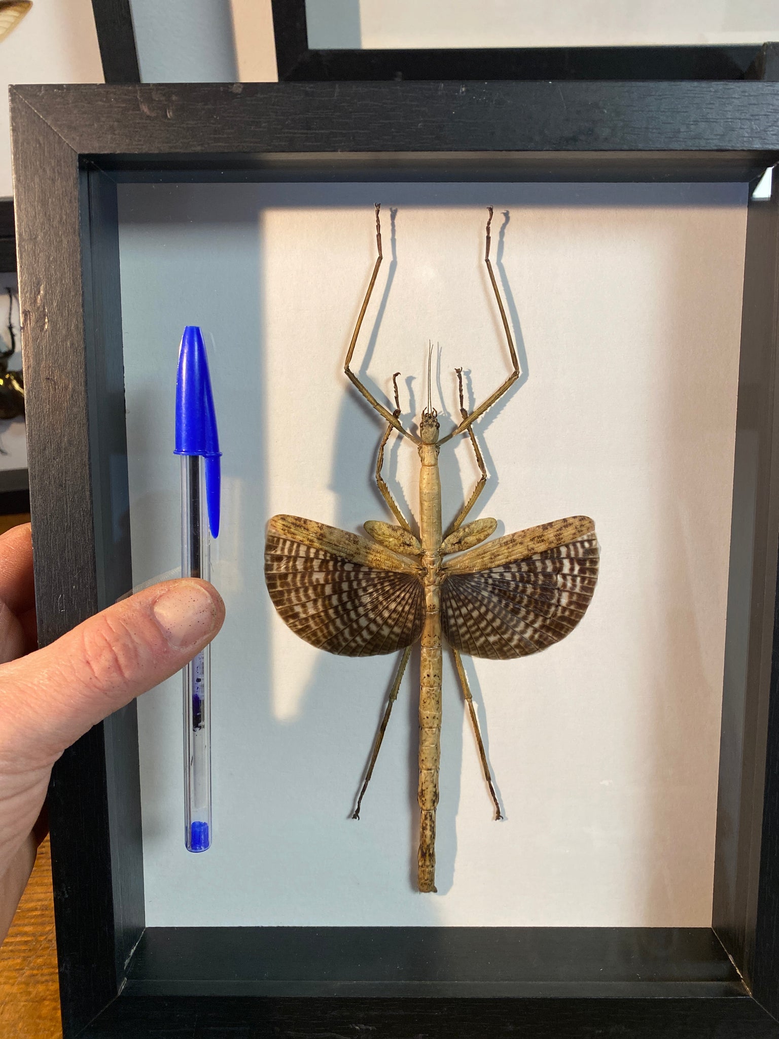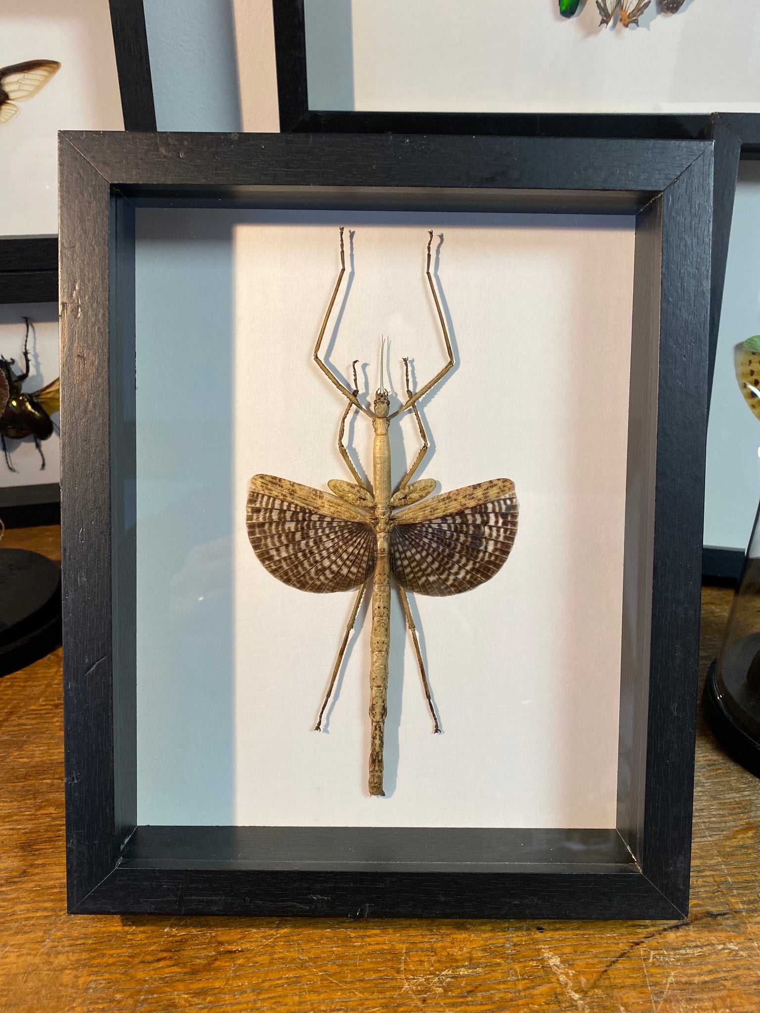 Cadre vitrine contenant un phasme anchiale buruense provenant d’Indonésie.