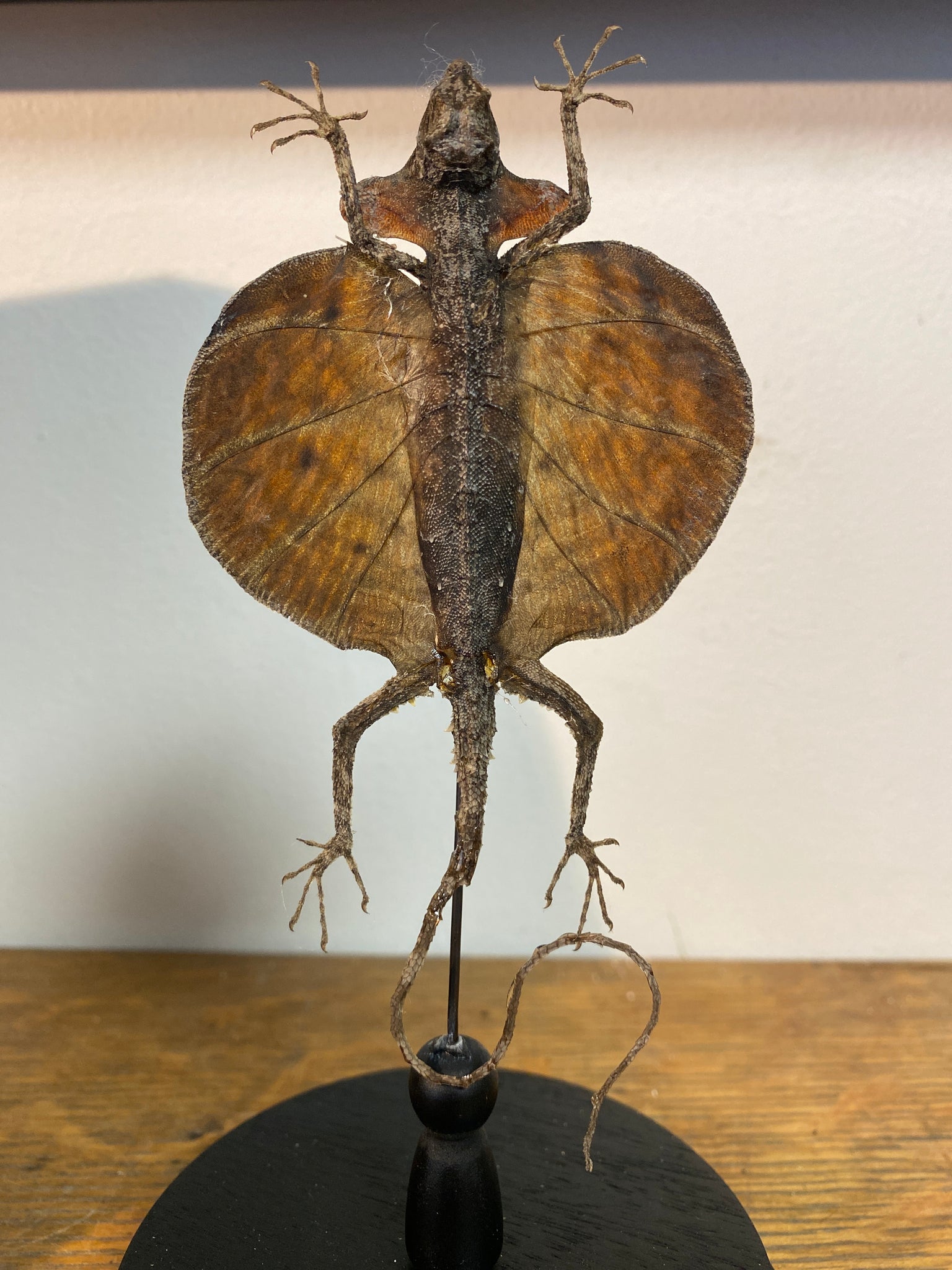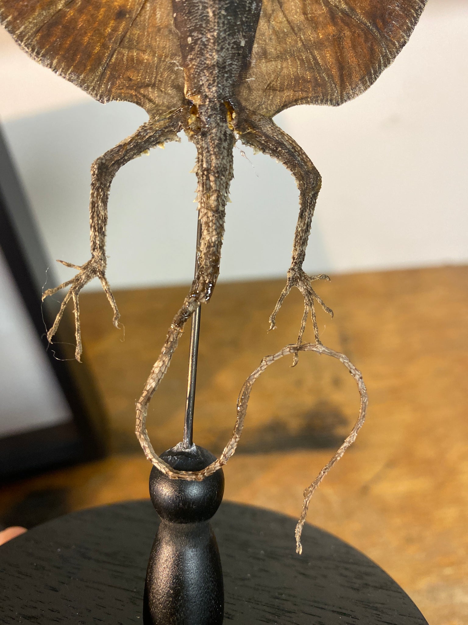 Véritable Lézard Volant ( draco haematopogon) présenté sous globe / cloche en verre, monté sur un support en bois peint et coller sur une tige métallique.